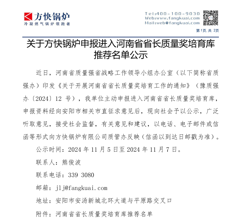 關于方快鍋爐申報進入河南省省長質(zhì)量獎培育庫 推薦名單公示